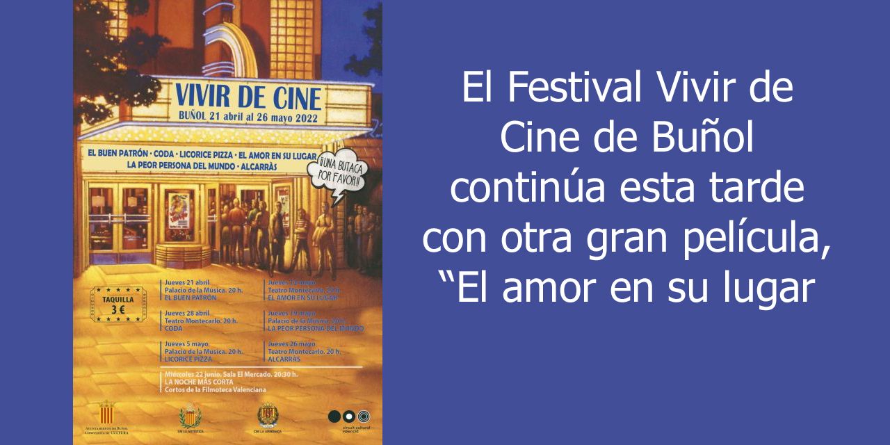 - Esta tarde a las 20h en el Teatro Montecarlo de Buñol podrá verse por una entrada de 3€ “El amor en su lugar” dentro del ciclo Vivir de Cine.