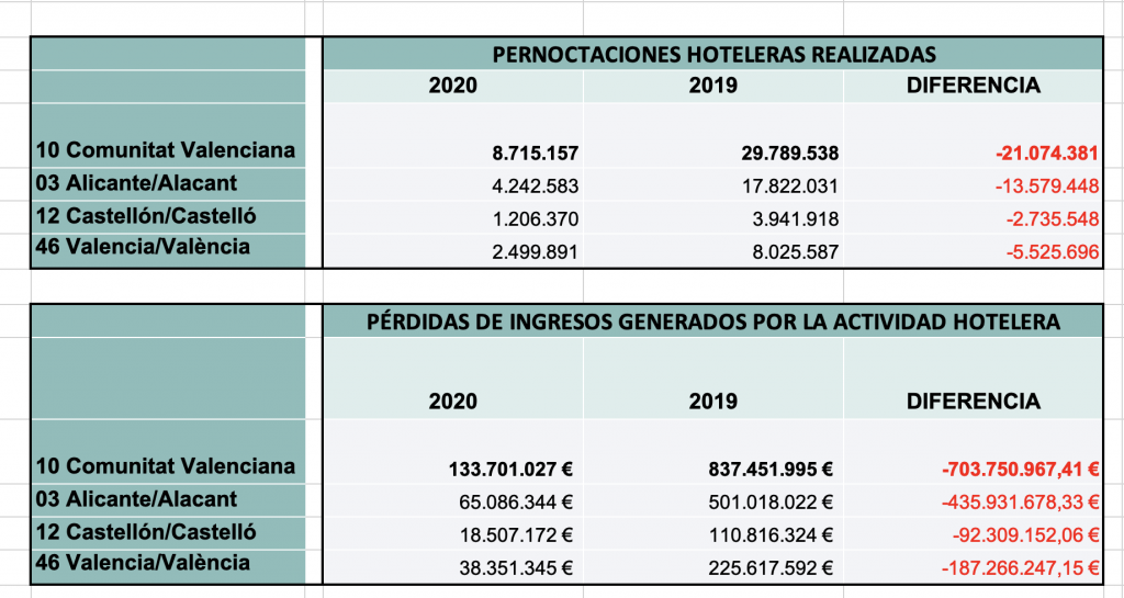 Las pérdidas del sector en la Comunitat Valenciana ascienden a más de 700 millones de euros sólo en alojamiento hotelero, y HOSBEC cifra 160 millones de euros el plan de rescate necesario para el sector.