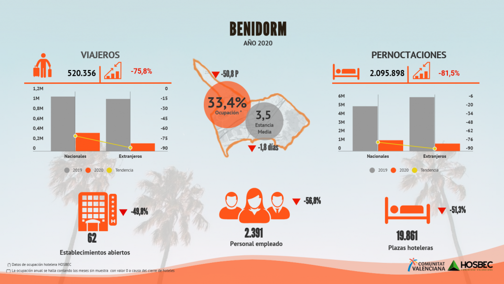 La Costa Blanca, en su conjunto, ha recibido un 68,9% menos de viajeros alojados en hoteles, lo que ha supuesto una reducción del 77% de las pernoctaciones hoteleras a lo largo de 2020.