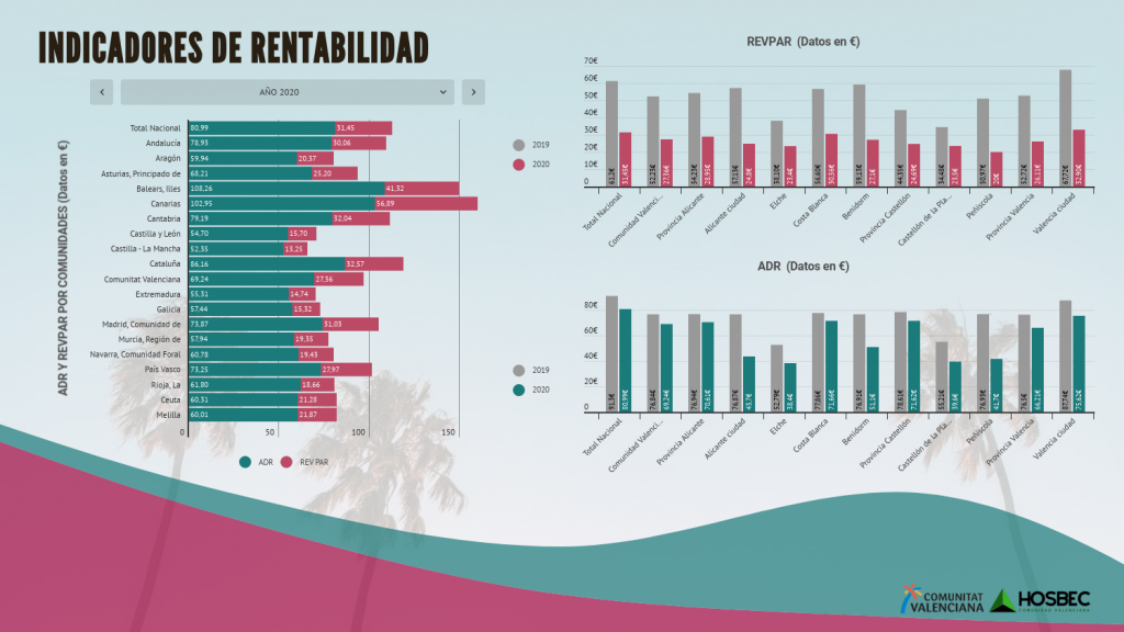 Mientras el ADR del conjunto de los hoteles de la Comunitat este 2020 muestra una tendencia negativa del 10% en relación a 2019, el dato verdaderamente relevante, el RevPar (ingresos por habitación disponible) se ve mucho más afectado con una caída del -48%.