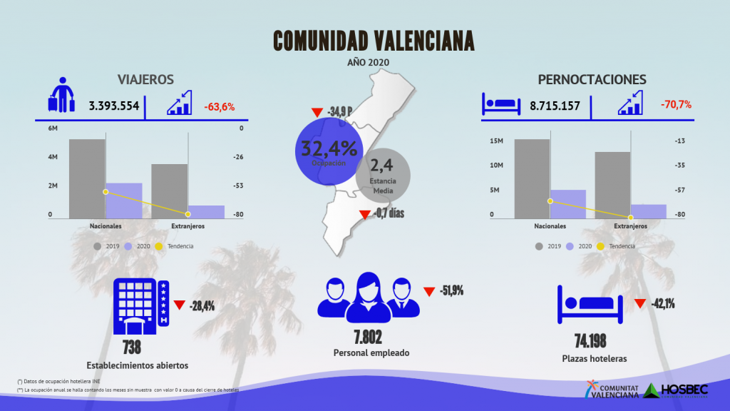 BigDataHosbec ha analizado los resultados del mercado hotelero durante el año 2020 en el ámbito de la Comunidad Valenciana y en sus diferentes destinos turísticos. Se da por finalizada una temporada estival marcada por el desastre, con la incertidumbre, los rebrotes, las restricciones a la movilidad, el cierre de alojamientos y la caída del turismo internacional como constantes desde el día 14 de marzo..